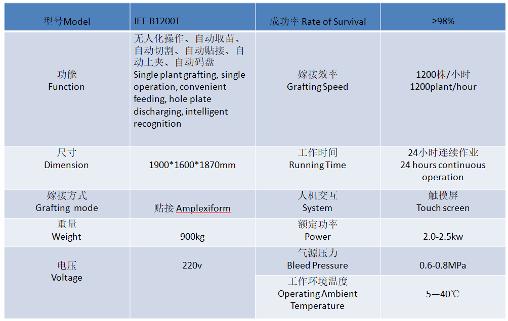 Efficiency: The whole grafting process is unmanned, 1200-1500 plants/hour, 24h continuous work Automatic code disc of finished seedlings, one-button operation, easy to use and maintain