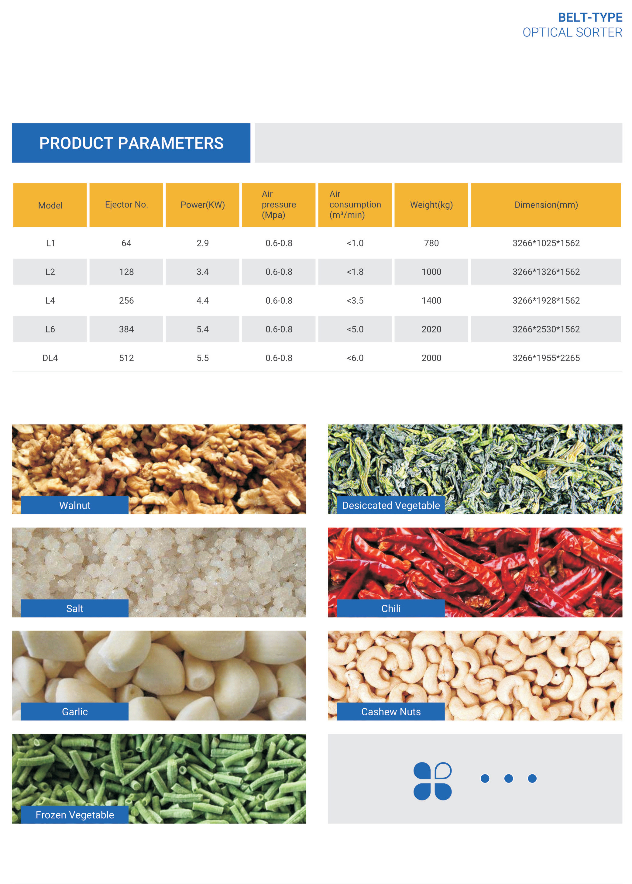 L Series Belt-Type Nuts Color Sorter can protect raw material from being broken. It can sort cashew, pecans, hickory, macadamia nut, almond and others. Foreign materials like stone can be detected and removed from the raw material.