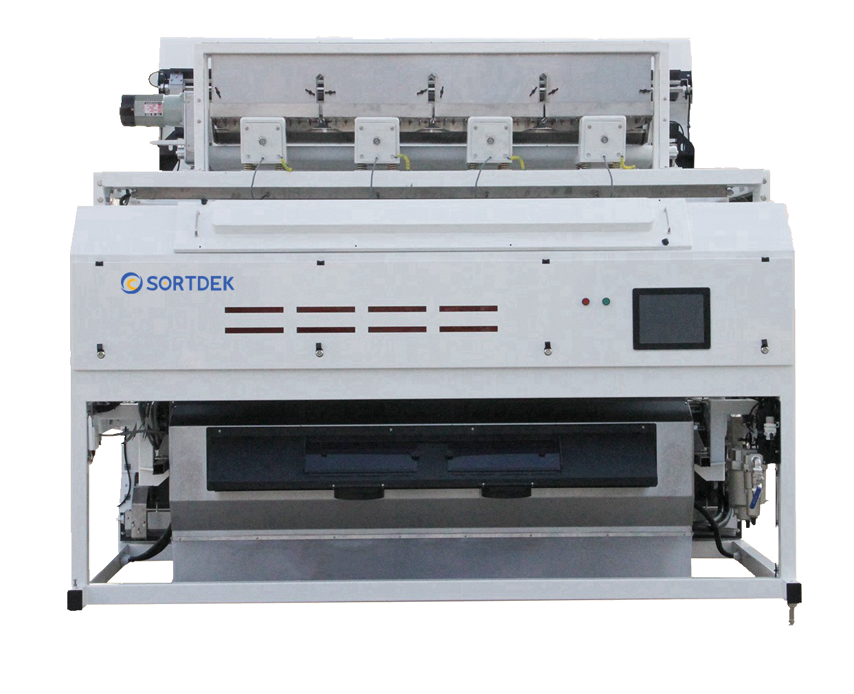 The product free flows down the chutes and is viewed by the sensors from both sides. The sensor outputs go to the signal processor and if the processor detects a “reject image” it fires the relevant ejector.