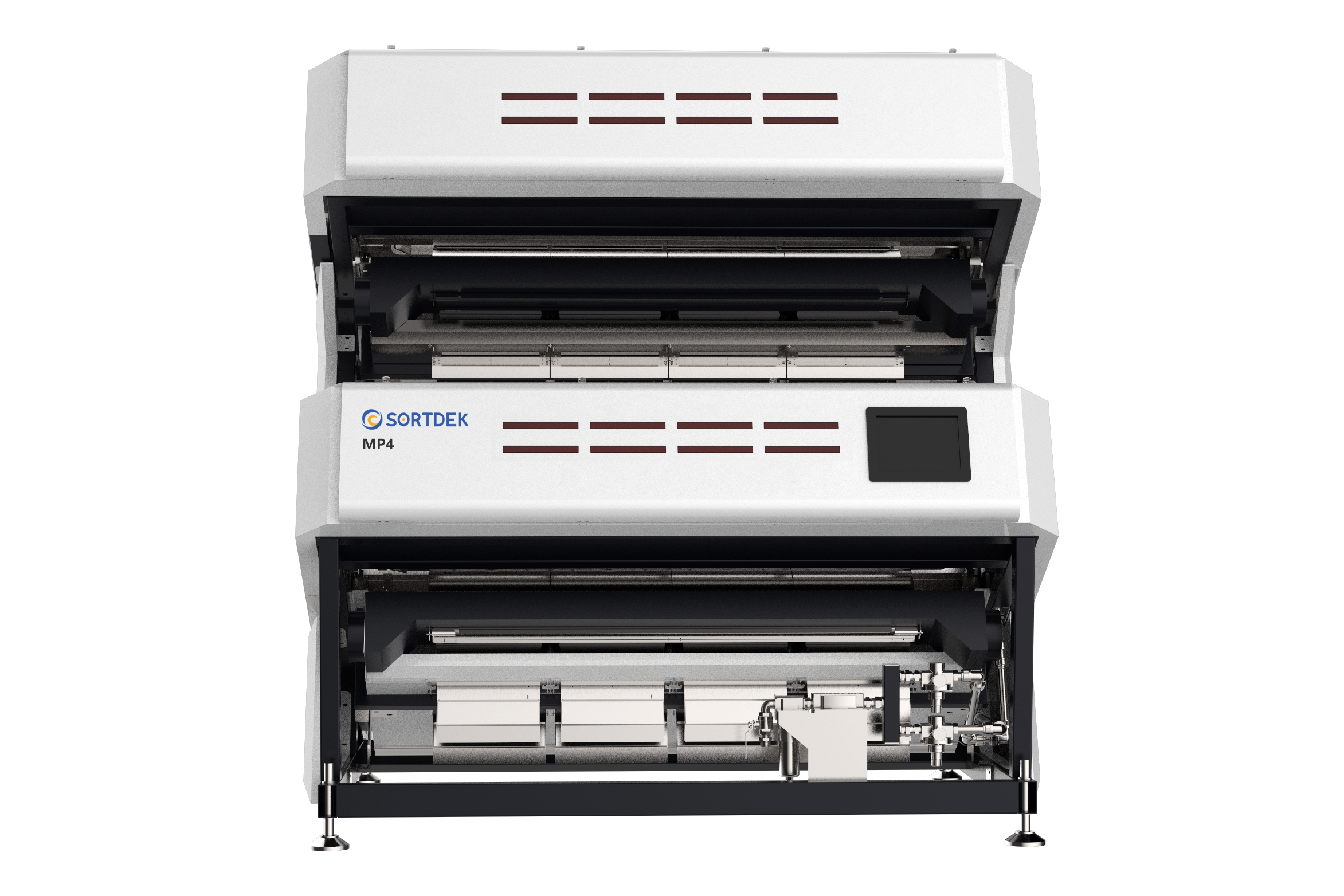 The product free flows down the chutes and is viewed by the sensors from both sides. The sensor outputs go to the signal processor and if the processor detects a “reject image” it fires the relevant ejector.