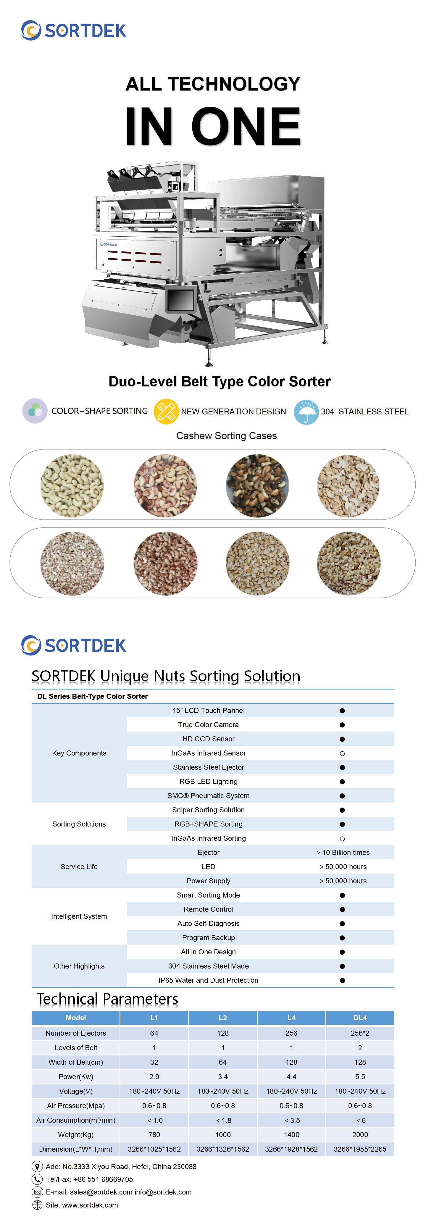 DL Series Doulble Layers Belt-type cashew color sorter can protect raw material from being broken. By the unique design, the sorter can sort cashew two time, makes higher efficiency and accracy.