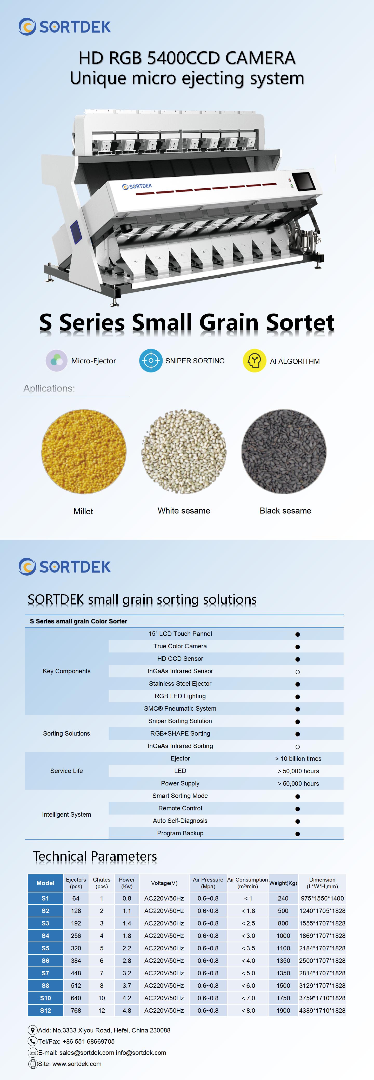 Small Grain Optical Color Sorting Machine S Series Features: