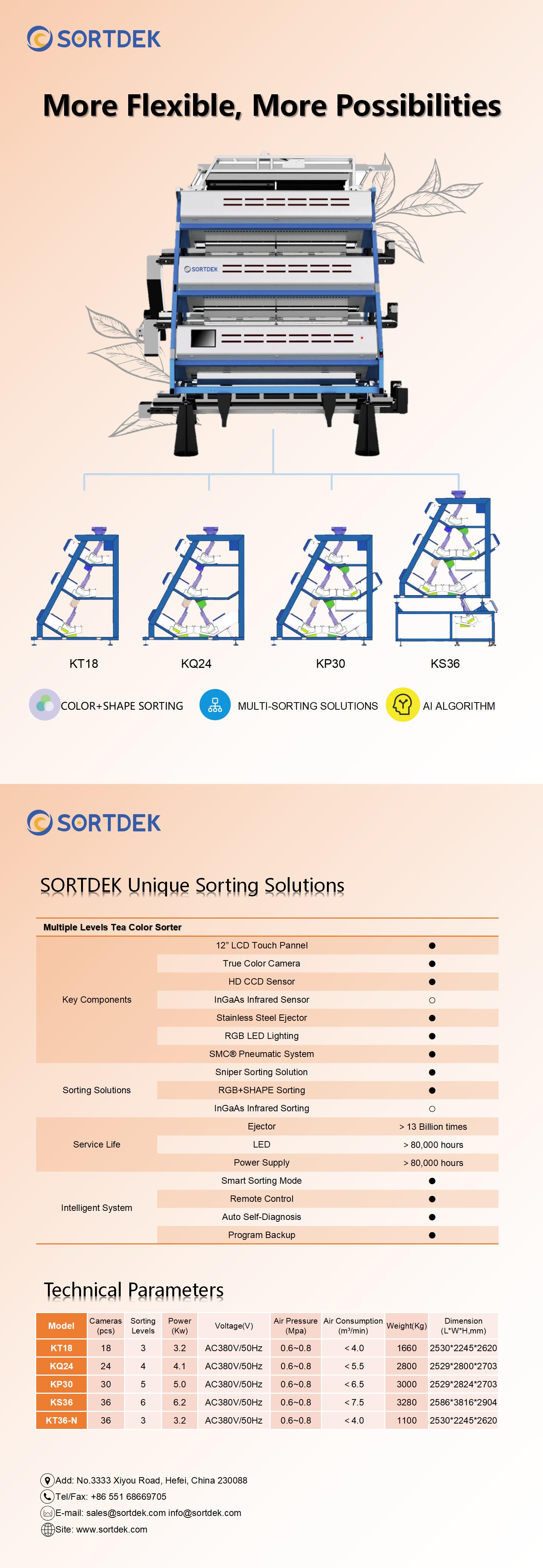 2). Flat chute with exclusive algorithm design for higher throughput, and direct dryer mouth can feed and sort.