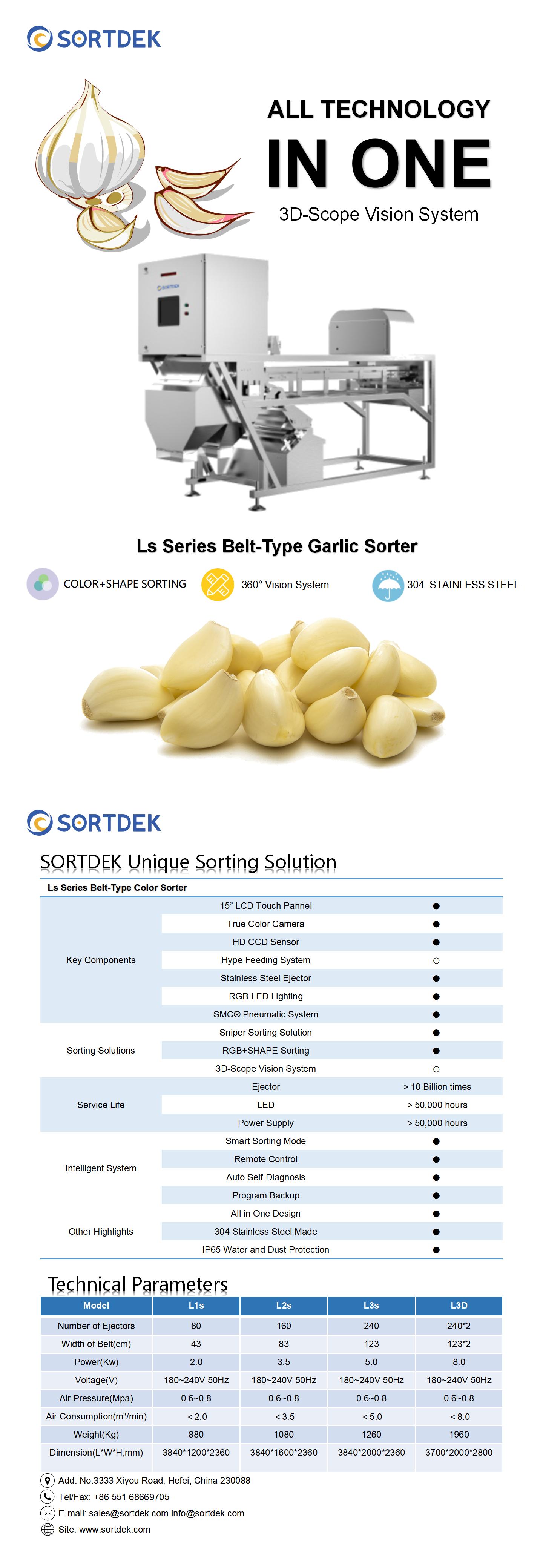 3D Scope Vision System ensure each piece of Garlic be scaned by 6 HD CCD Cameras.